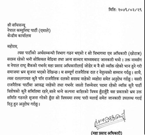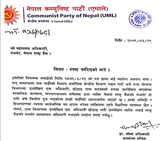 एमाले कार्यालय सचिव भीष्म अधिकारीले बुधबार गभर्नर अधिकारीलाई स्पष्ट पारिएको व्यहोराको पत्र पठाउँदै सार्वजनिक पद धारण गरेका व्यक्तिहरु एमालेको विभागमा नराख्ने वैधानिक व्यवस्था रहेको उल्लेख गरेका छन् ।